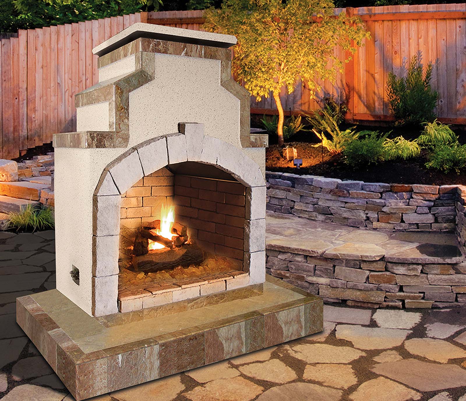 Cal Flame's outdoor fireplaces come in a standard configuration with a natural bedrock stone mantle and arch. However, you also have the option to select from a variety of Porcelain Tile designs at no additional cost. Porcelain tile is highly durable, withstanding heat and resisting stains with ease.