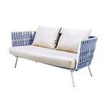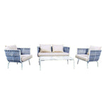 Spencer 4 Piece Conversation Set with Cushions offers modern design in materials that evoke classic seaside living. The Spencers Set contains a strong iron frame and roping intertwine to bring simple contemporary beauty to your outdoor living space. This set includes a loveseat and two club chairs finished with weather-resistant cushions and a coffee table to complete this conversation set.