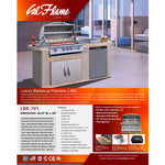 The LBK-701 is a fully functional BBQ island that offers a luxurious grilling and dining experience. It comes equipped with the 75,000 BTU 4-burner Cal Flame Grill and a side burner that features a removable cover. The island also includes double access doors for added organization and a temperature-controlled stainless steel refrigerator to keep beverages cold. Its heavy-duty construction is easy to clean and built to last. The LBK-701 is customizable to suit your individual taste and needs.
