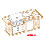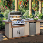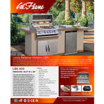 The LBK-820's sleek and simple design will add elegance to your outdoor living space. Its spacious counter top can accommodate accessories, main dishes, and drinks. This model comes standard with a 75,000 BTU 4-burner Cal Flame grill, a stainless steel temperature-controlled refrigerator, a side burner, and an outdoor electrical outlet. The centralized 30" double access doors located under the grill provide ample space for hiding the propane tank and other dry storage. With its luxurious features, the LBK-820 is designed to provide an exceptional grilling experience.