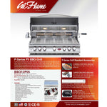 The Cal Flame P5 5-Burner Drop-In Gas Grill is the perfect outdoor pro-style grill for grilling enthusiasts. Constructed with 304 Stainless Steel, this 40-inch grill features five 15,000 BTU cast Stainless Steel burners with independent easy-start ignition, producing a total of 95,000 BTU of cooking power on a spacious 1,000 sq. in. cooking surface. It comes with interior lights for night-time grilling, a 110V full-size rotisserie, a griddle, a smoke box, lip guards on all burners to prevent clogging, 5 exclusive heavy-duty V-grates, a full-width warming rack with two positions, a thermometer to monitor temperature, a full-width drip tray, black cover, and exclusive heavy-duty Cal Flame knobs. The grill allows for optional upgrades with a sear zone burner or smoke tray to enhance grilling alternatives. It is available in both liquid propane (LP) or natural gas (NG).