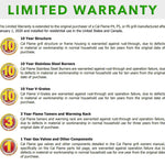 The Cal Flame warranty covers the tamers and warming rack against rust-through and operation failure caused by defects in material or workmanship in normal household use. This warranty is valid for a period of three years from the original date of purchase.