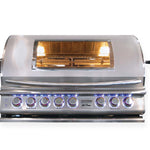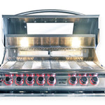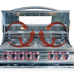 The Top Gun™ 5 Burner Convection Drop-In Grill is a cutting-edge grill that can be seamlessly integrated into any Cal Flame barbecue cart or island. Made with 304 stainless steel, it is equipped with five cast stainless steel burners and a unique convection system that evenly distributes heat throughout the cooking surface. For added convenience, it has a hood with a glass window, allowing you to easily monitor your food while it cooks. Additionally, each stainless steel knob is equipped with a striking new light feature, which is an exclusive design by Cal Flame.
