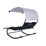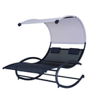 This ultra comfortable cool mesh dual lounge rocker with a built in canopy is the perfect addition for any outdoor space. This sleek lounger comfortably fits two adults and is perched upon double rockers for ultimate relaxation. Designed with you in mind, this lounger is perfect for sunbathing, but also protects you from the elements with a weather resistant lightweight polyester canopy. Relax in style on the cool mesh textilene fabric and moisture wicking fabric pillows attached for extra comfort. Includes chair, canopy, and 2 pillows. Assembly Hardware included.