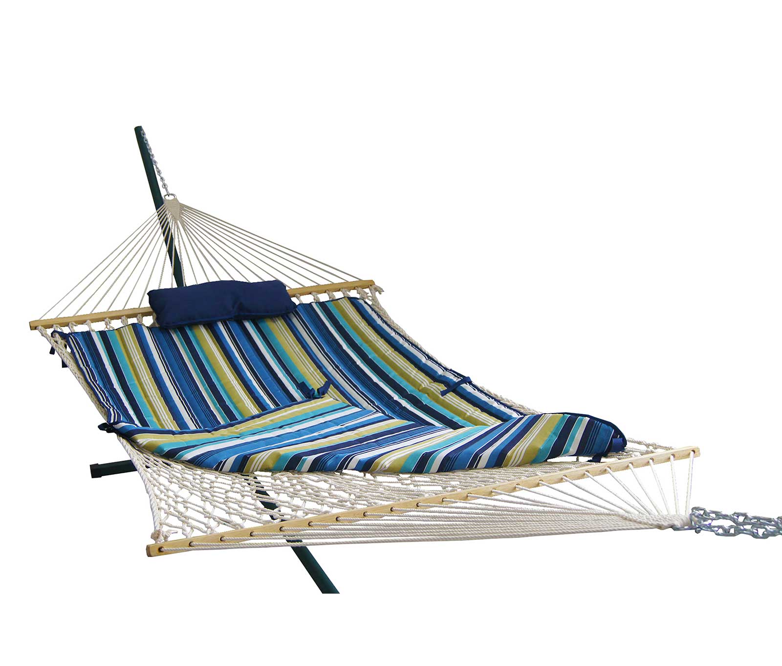 Turn any outdoor space into a comfortable, relaxing retreat! The Island Retreat 12-ft cotton rope hammock set with its stylish, modern, stripped polyester pad and comfortable pillow has everything you need to start relaxing right away. The stand wheels allow one person to move the hammock around to the desired location with ease. This oversized, comfortable 12-ft hammock is large enough for a single person to easily relax and enjoy afternoon days in the comfort of their backyard retreat. So go ahead, take a moment to breathe in the fresh air and totally relax in your carefully crafted Island Retreat hammock. Weight capacity: 275-lbs. 1-year limited warranty.