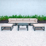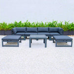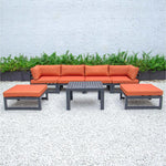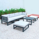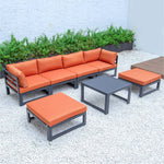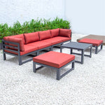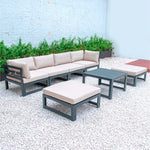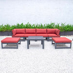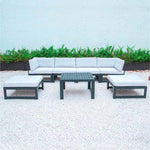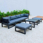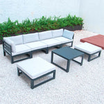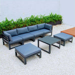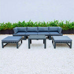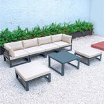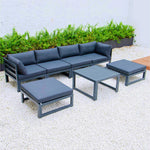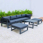 LeisureMod Chelsea 7-Piece Patio Ottoman Sectional And Coffee Table Set Black Aluminum With Cushions